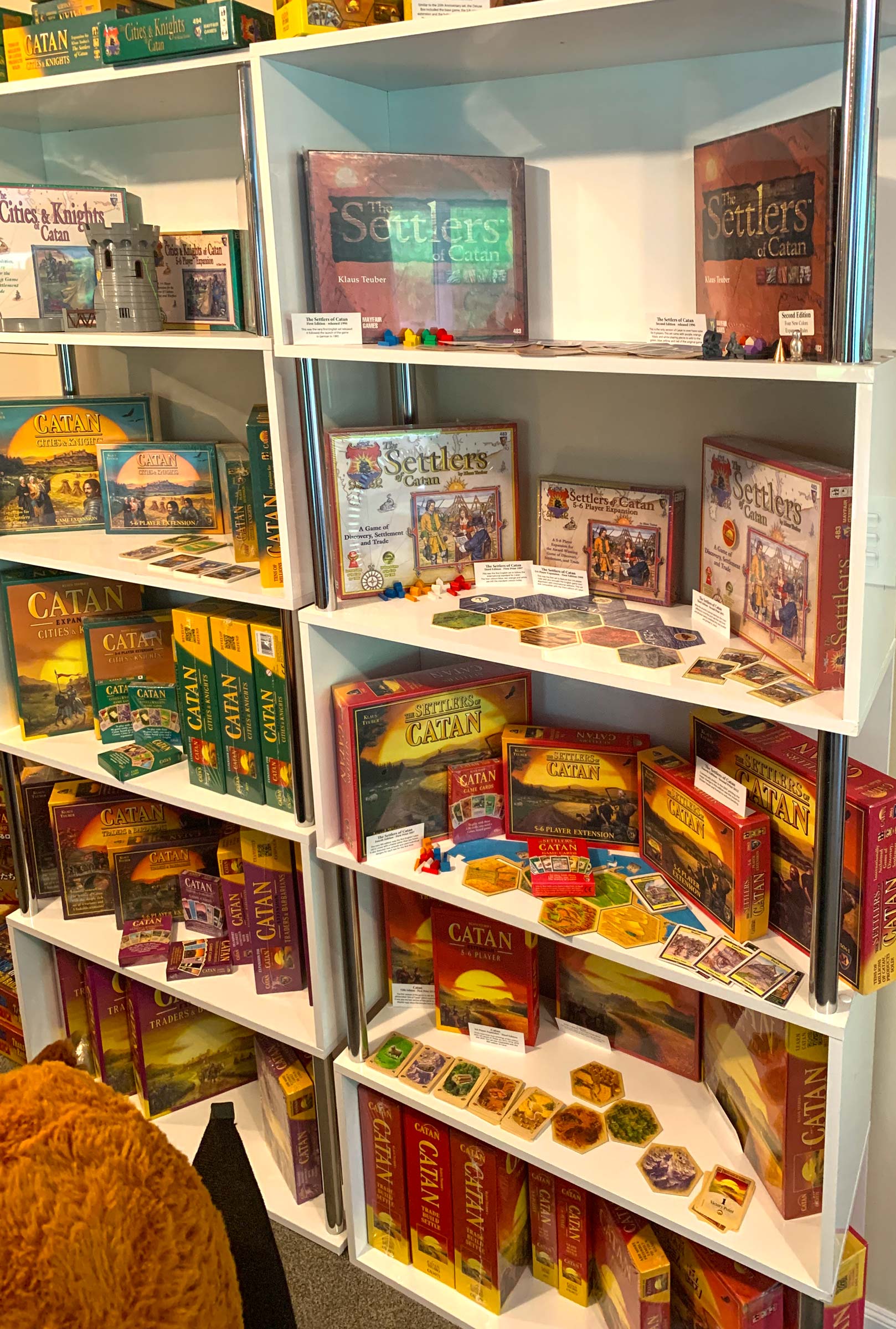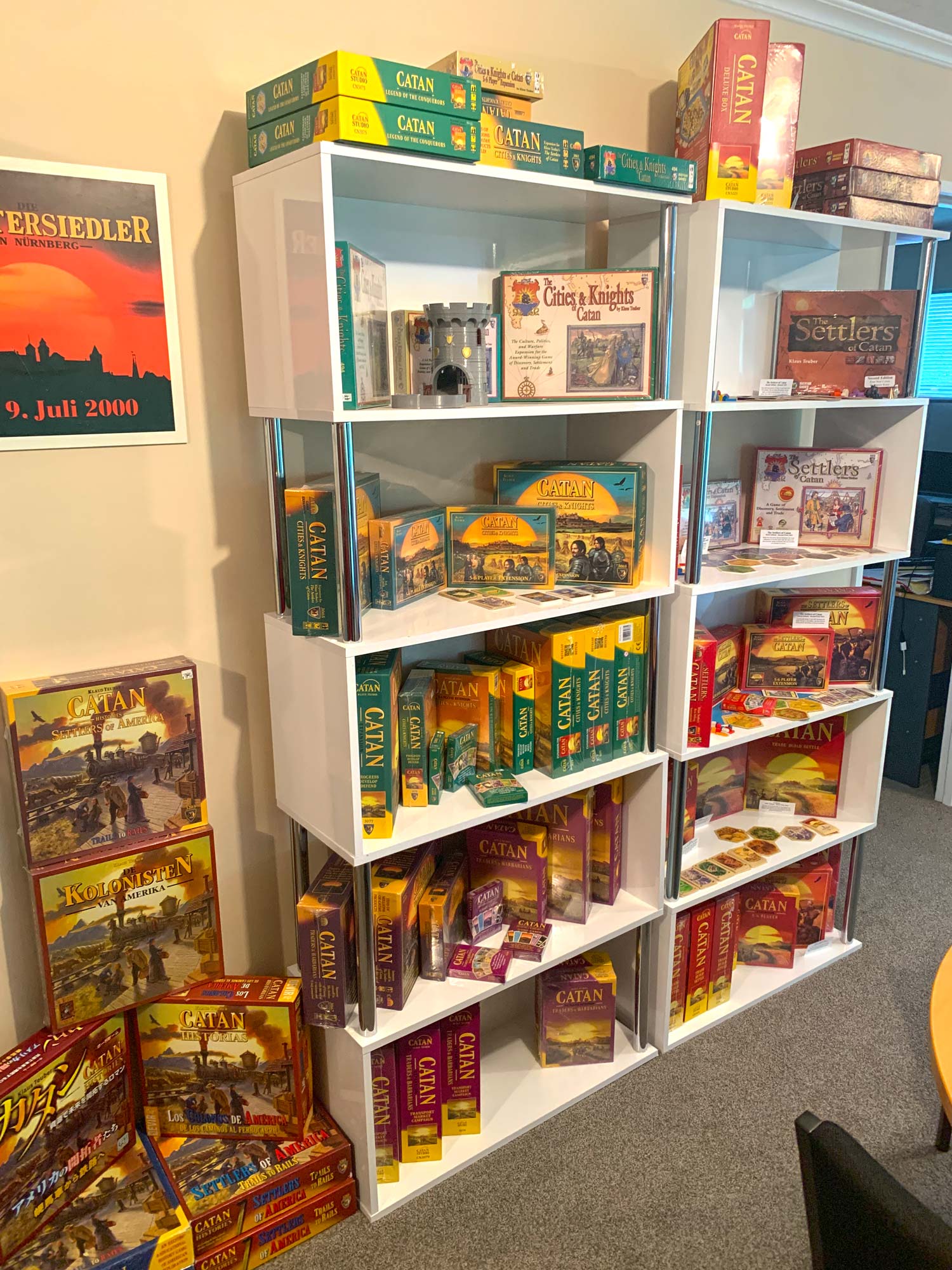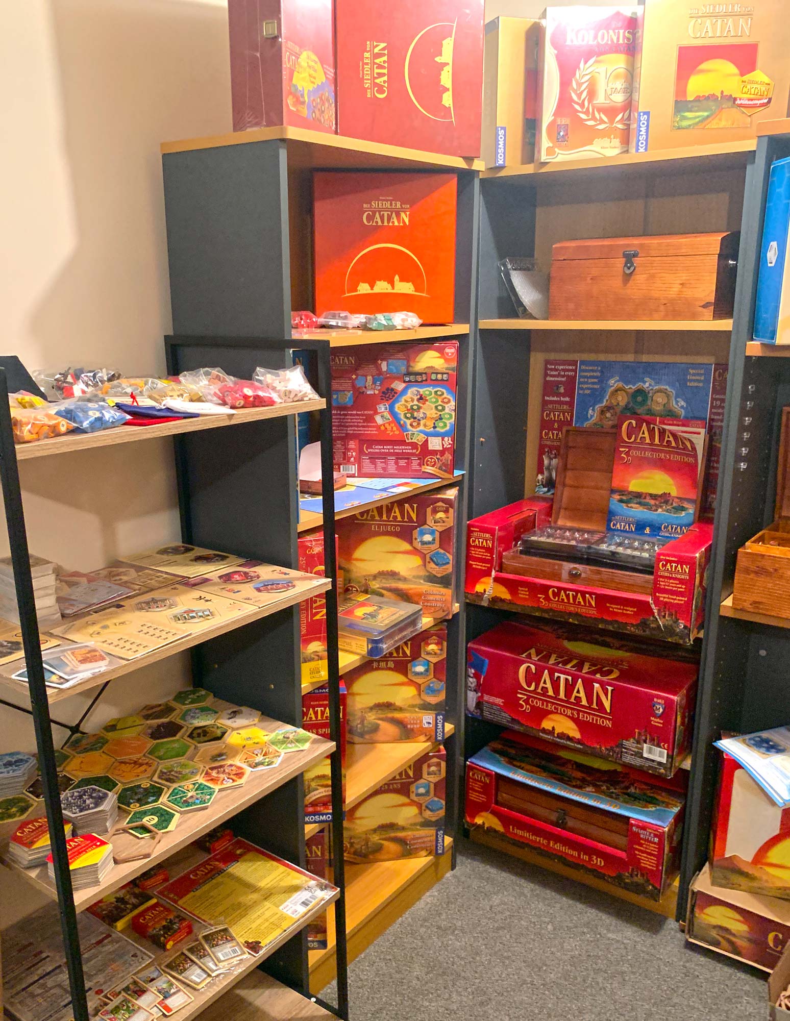1. Second room foreign language wall, 2. Hexes, scenarios and anniversary sets, 3. Catan 3D sets 2005 and 2021