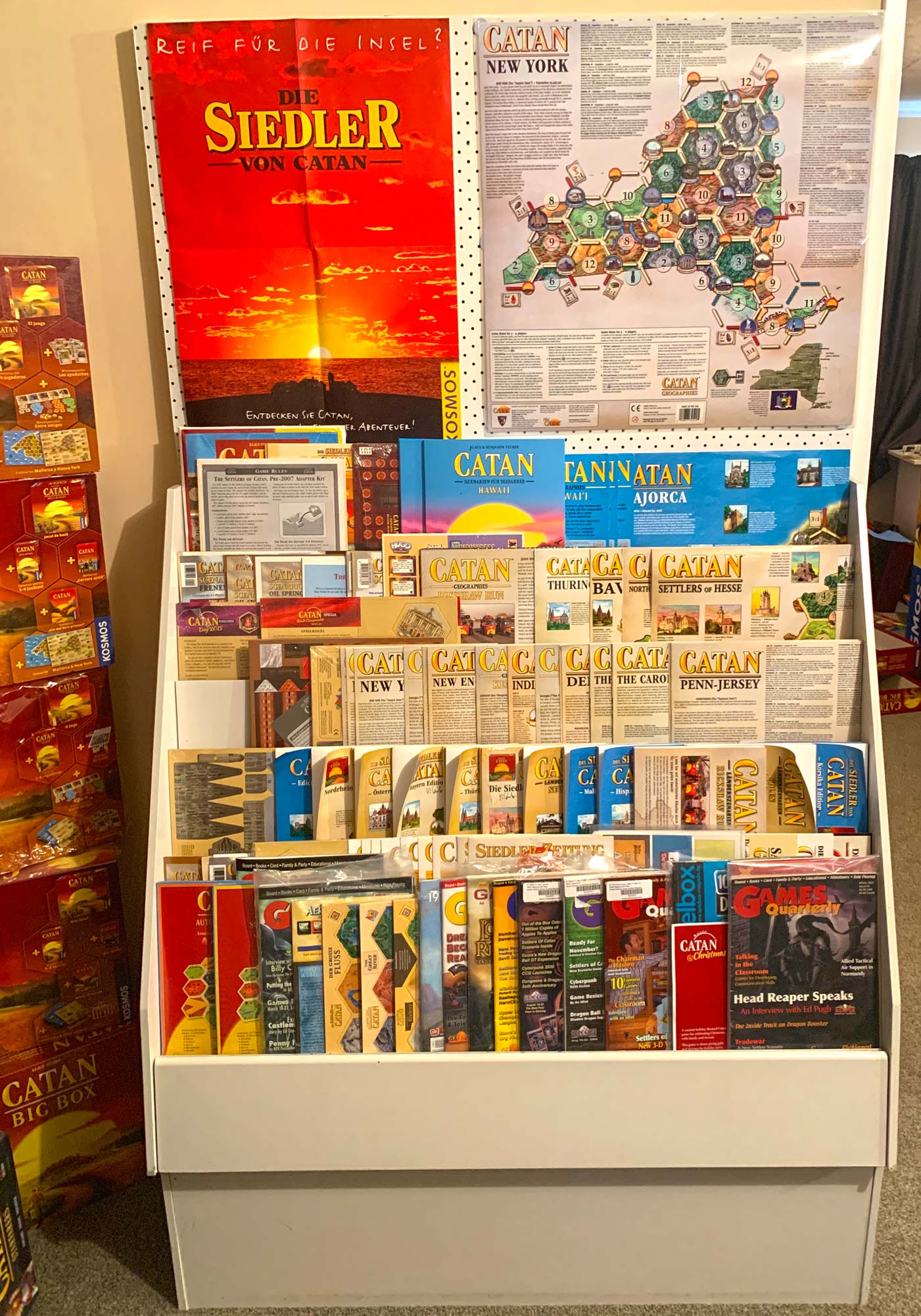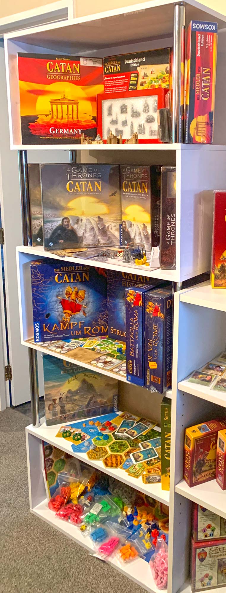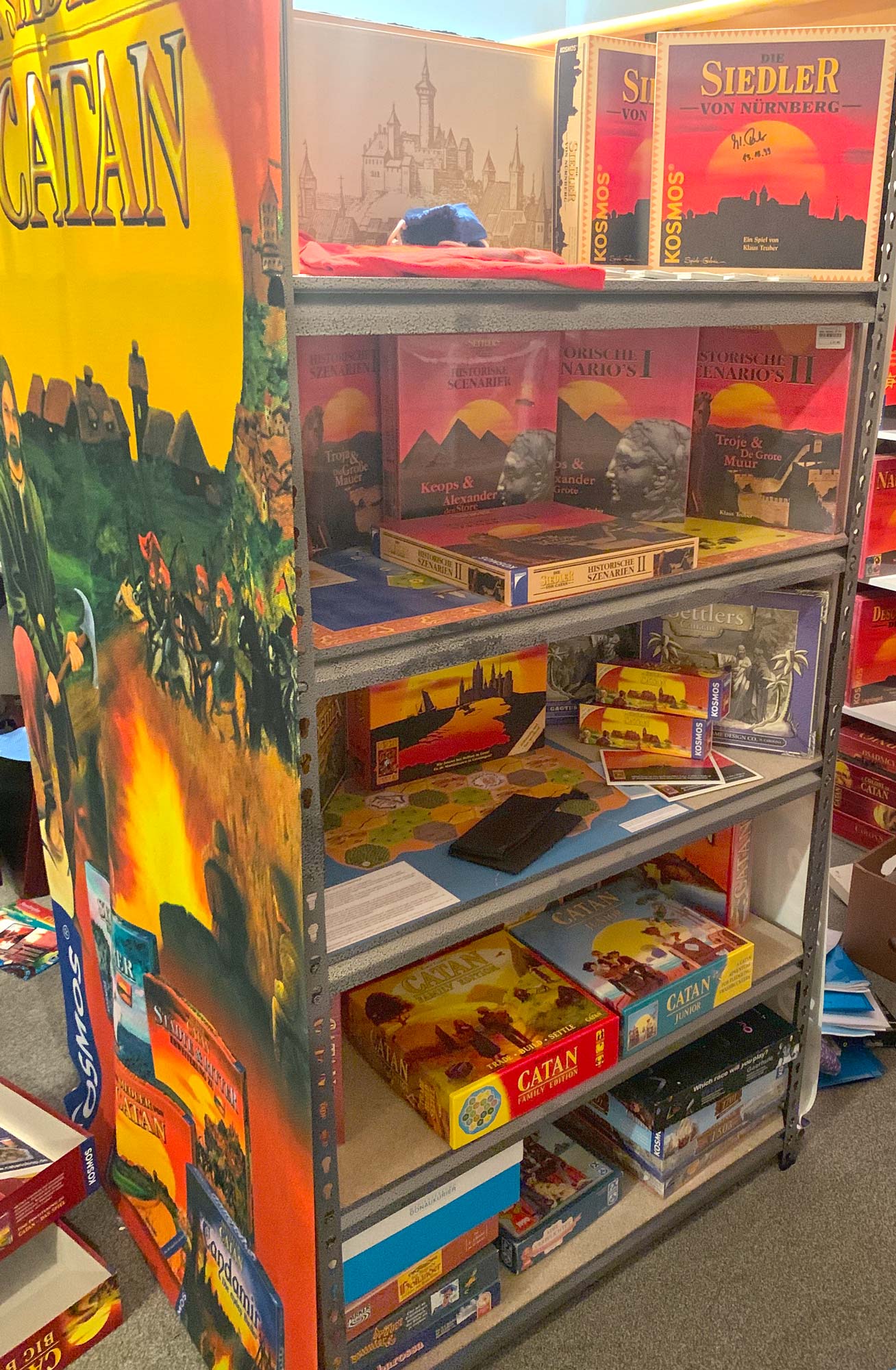 1. Second room foreign language wall, 2. Hexes, scenarios and anniversary sets, 3. Catan 3D sets 2005 and 2021