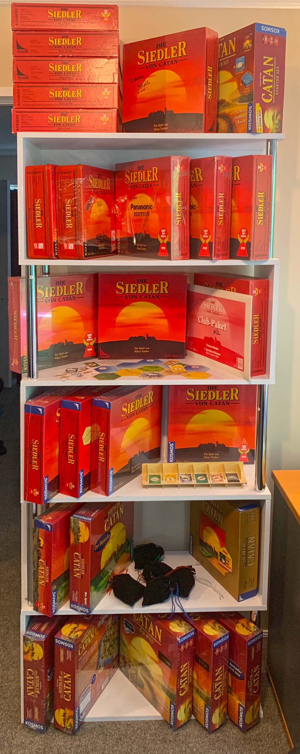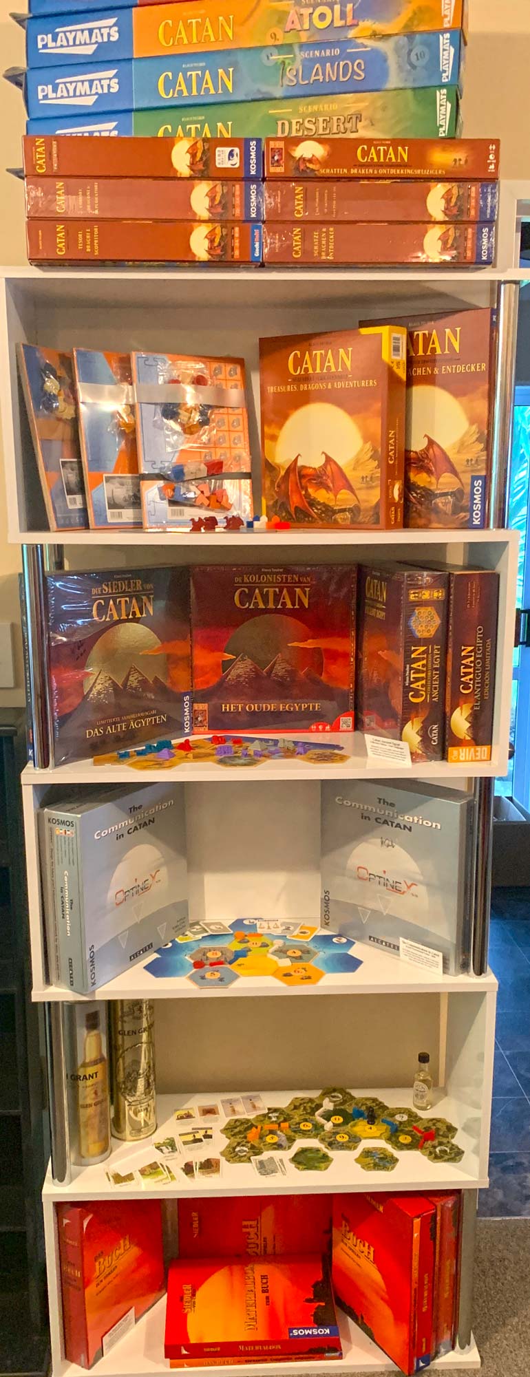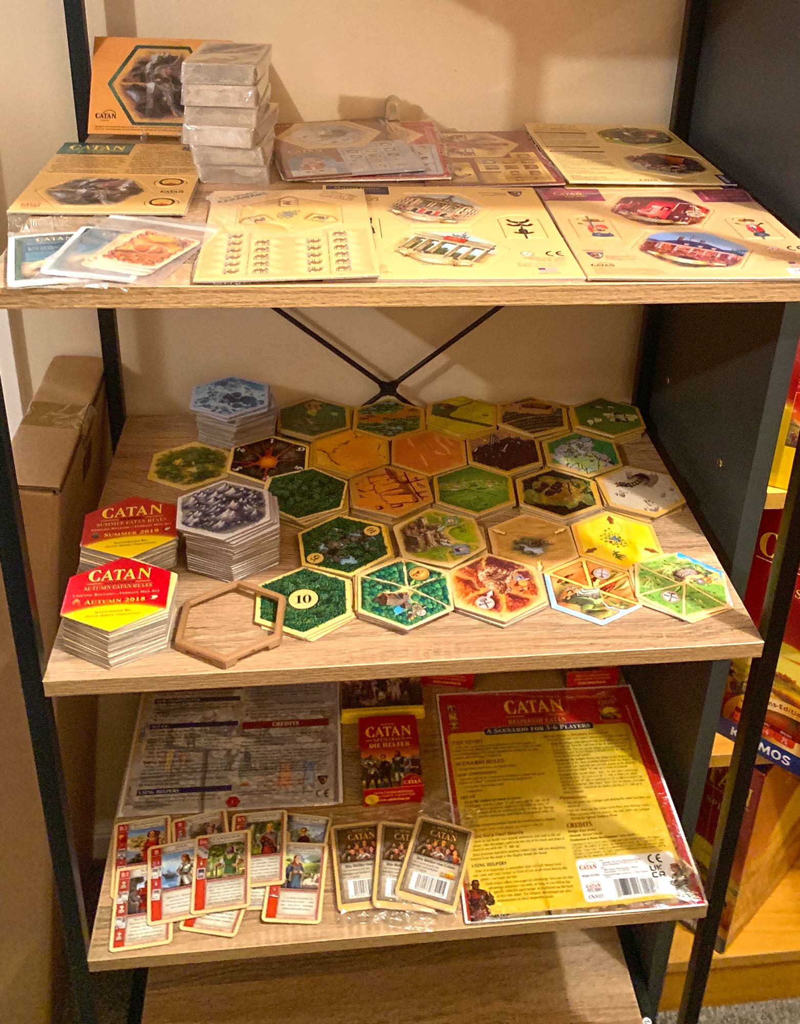 The main area in the image below is mostly my English Catan. Of the almost 300 items I have identified in my English product list, I now have over 96% of them. The last items to find will be a challenge, but I will get there.