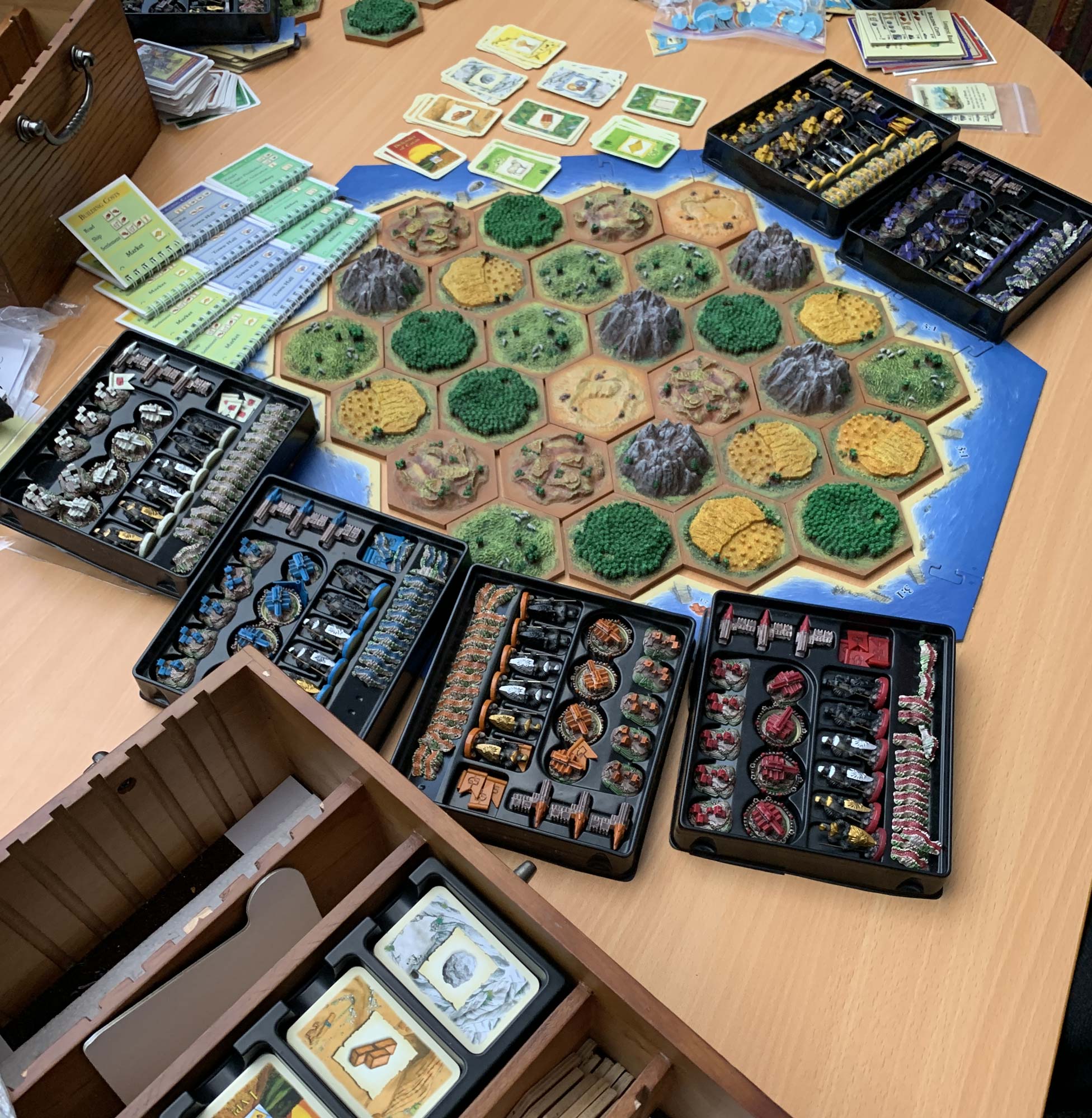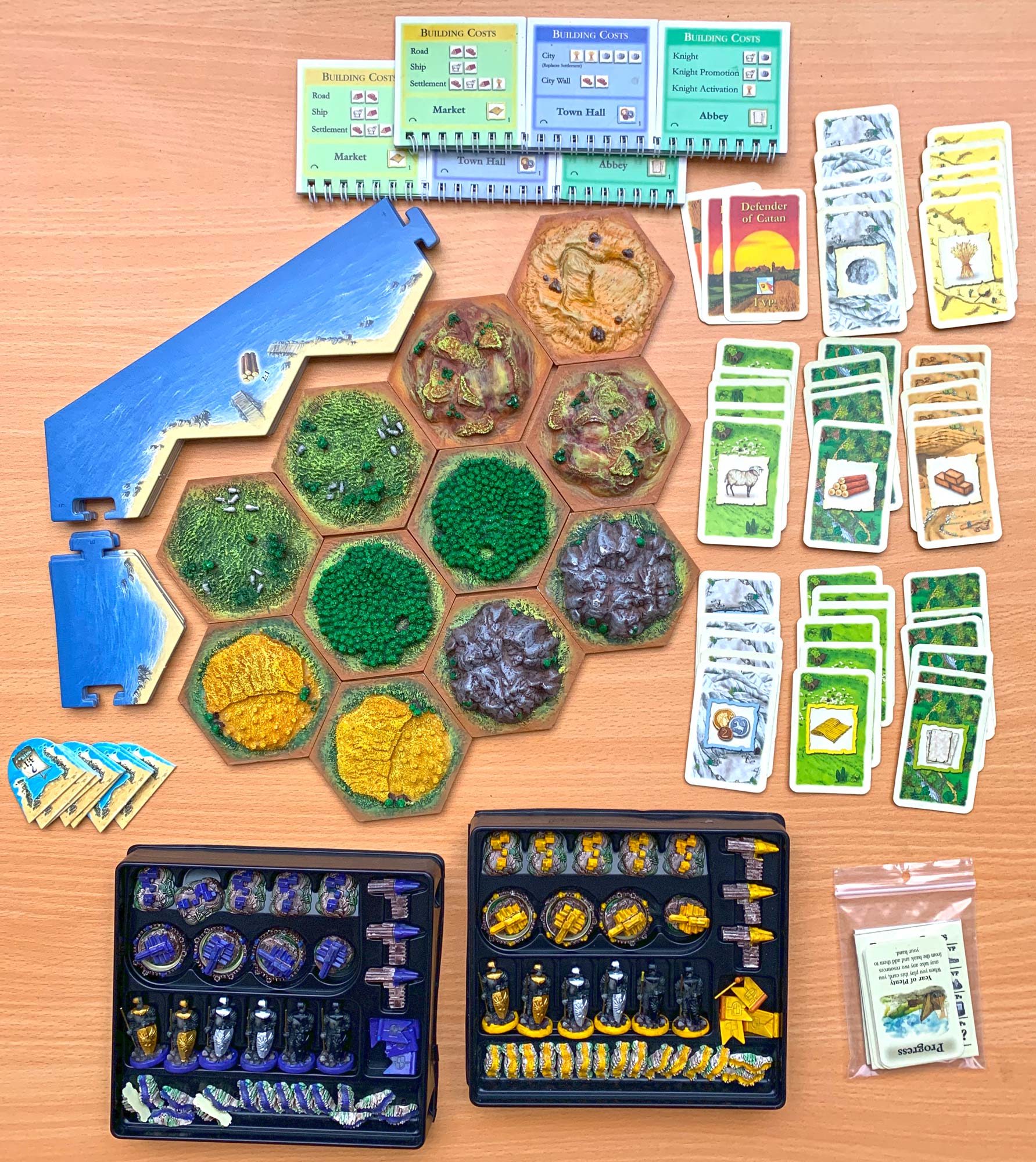 In the used 3D set I have recently bought some bits were missing and sadly added to this some hexes were damaged in transit. However using what was left and some spare 3D parts from elsewhere I have enough to make a full 5/6 player Base extension as well as a 5/6 player Cities & Knights extension. The best part is that in the sea chest there was a full set of original small sized cards that were unused. Whoever originally bought the game preferred larger cards so had bought a set and used these instead of the ones that came with the game. My original cards are getting quite worn so getting a brand new original set is really great.
