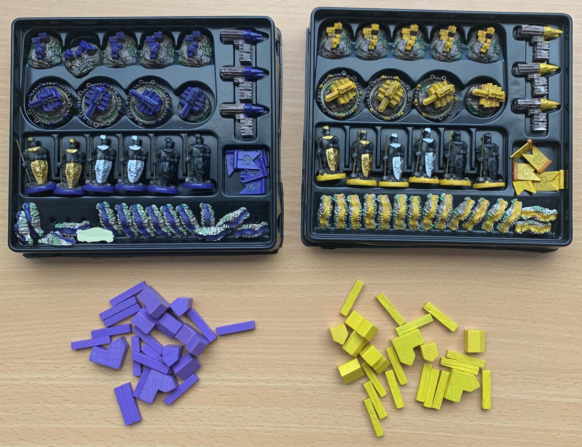 6 Knights (2 Basic, 2 Strong, 2 Mighty), 3 City Walls - Purpple Player pieces: